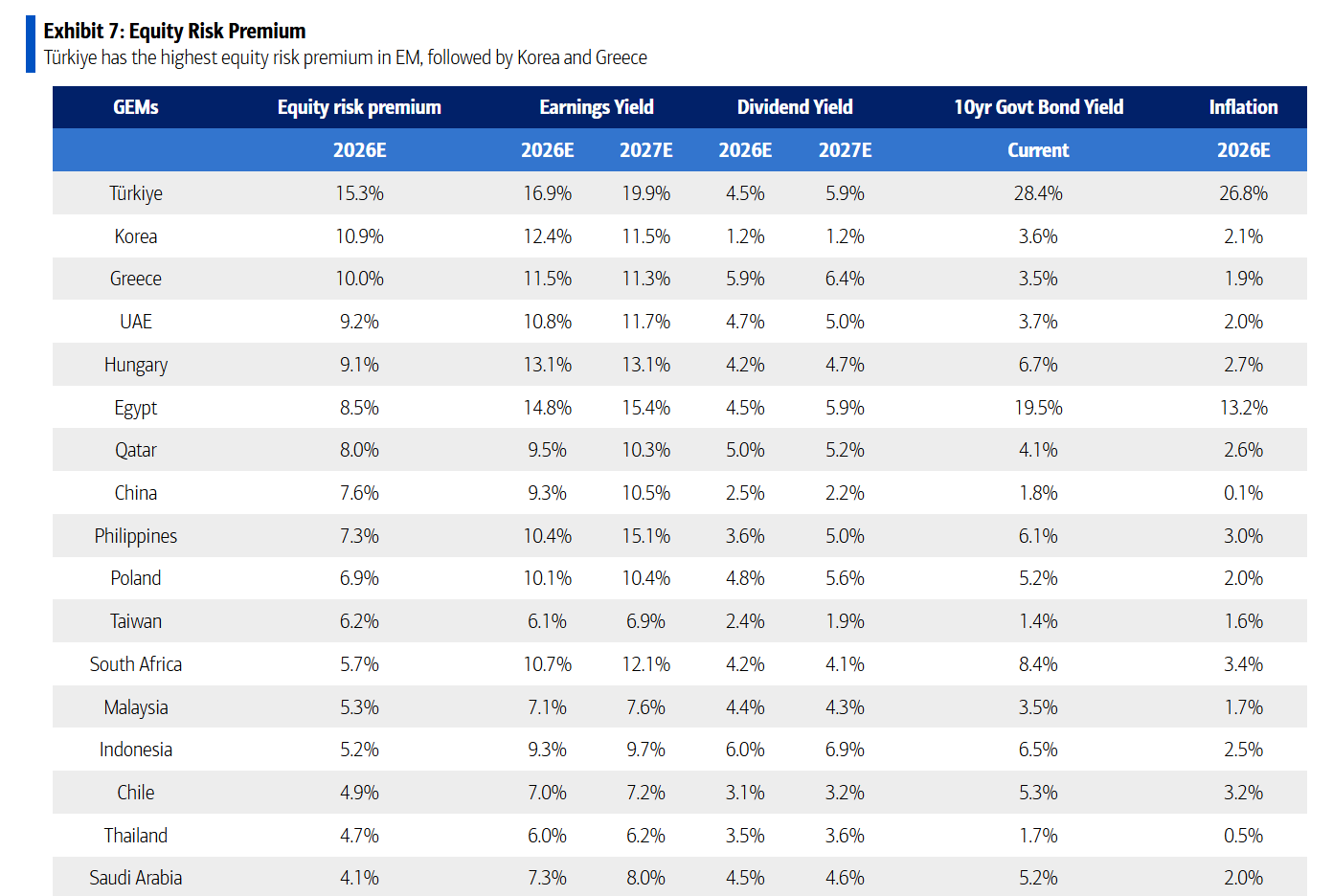 Σε επίπεδο αποτιμήσεων, η BofA σημειώνει ότι οι αγορές της περιοχής εμφανίζουν σημαντικές διαφοροποιήσεις.