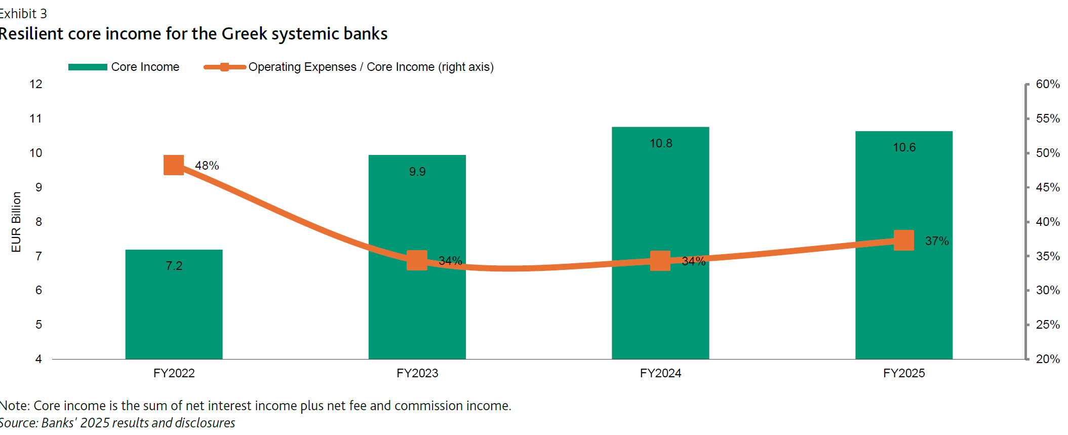 Παρά την αποκλιμάκωση των επιτοκίων, τα βασικά έσοδα των τραπεζών παρέμειναν ανθεκτικά. Τα καθαρά έσοδα από τόκους υποχώρησαν κατά περίπου 4,7% το 2025 σε ετήσια βάση, κυρίως λόγω της πίεσης στα επιτοκιακά περιθώρια, ωστόσο η ισχυρή πιστωτική επέκταση βοήθησε να περιοριστεί η πτώση.