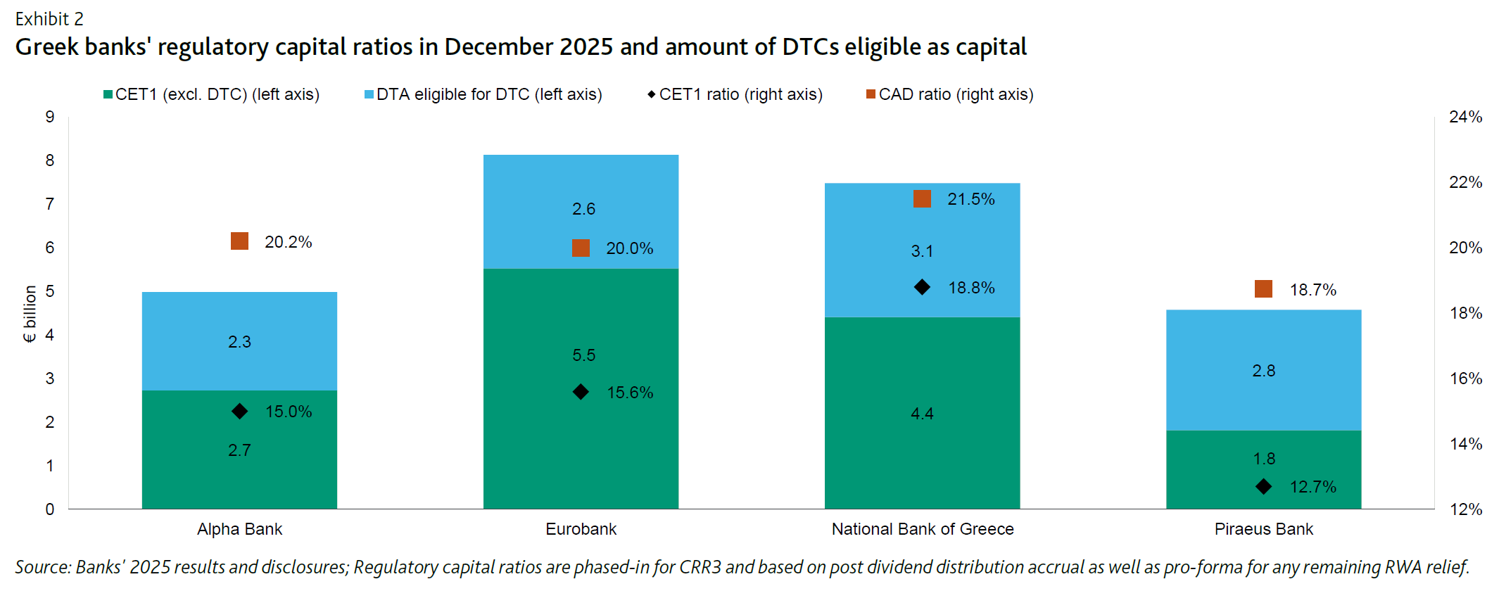 Παράλληλα, η ποιότητα κεφαλαίων συνεχίζει να βελτιώνεται καθώς μειώνεται σταδιακά το ποσοστό των αναβαλλόμενων φορολογικών πιστώσεων (DTCs). Οι DTCs ανέρχονταν σε περίπου 10,7 δισ. ευρώ στο τέλος του 2025, αντιπροσωπεύοντας περίπου το 42% των συνολικών κεφαλαίων CET1, έναντι περίπου 69% το 2022.