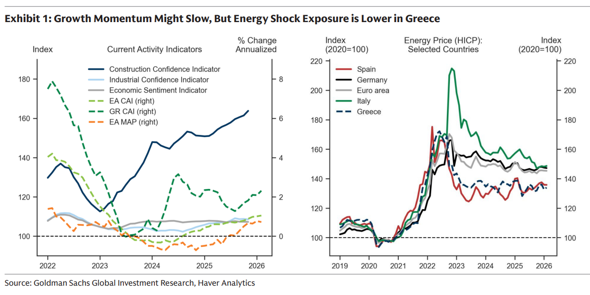 Η ελληνική οικονομία εμφανίζεται πιο ανθεκτική από την υπόλοιπη Ευρωζώνη απέναντι στο νέο ενεργειακό σοκ που συνδέεται με την ένταση στη Μέση Ανατολή και ειδικότερα με τη σύγκρουση γύρω από το Ιράν, σύμφωνα με νέα ανάλυση της Goldman Sachs.