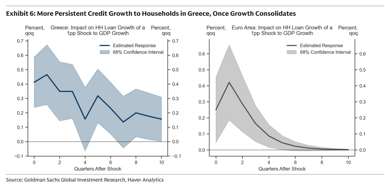 Μάλιστα, η αντίδραση της πιστωτικής επέκτασης στην οικονομική ανάπτυξη είναι πιο έντονη και διαρκεί περισσότερο στην Ελλάδα σε σχέση με την υπόλοιπη Ευρώπη.