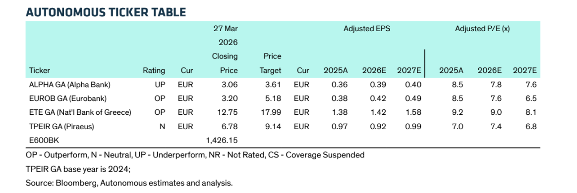 Η Autonomous διατηρεί σαφή προτίμηση για τη Eurobank και την Εθνική Τράπεζα, τις οποίες αξιολογεί με σύσταση υπεραπόδοσης. Οι τιμές-στόχοι τοποθετούνται στα 5,2 ευρώ για τη Eurobank και στα 18 ευρώ για την Εθνική, με περιθώρια ανόδου 56% και 42% αντίστοιχα.