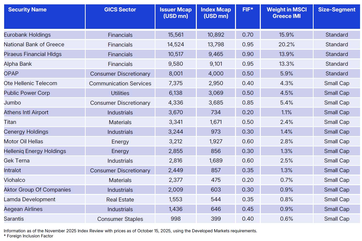 Τη σύνθεση συμπληρώνει μια ευρεία ομάδα εταιρειών που, αν και κατατάσσονται ως Small Cap στο πλαίσιο του MSCI Greece IMI, πληρούν τα κριτήρια Developed Markets.