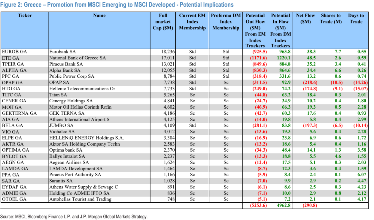 Σε επίπεδο διεθνών δεικτών, η MSCI εκτιμά ότι η Ελλάδα θα αποκτούσε παρουσία στον MSCI Europe με πέντε μετοχές και pro forma βάρος περί το 0,36%, ενώ στο MSCI World το αντίστοιχο βάρος θα διαμορφωνόταν κοντά στο 0,06%. Σε κάθε περίπτωση, το κέντρο βάρους των ροών παραμένει στις τράπεζες και στους λίγους μεγάλους τίτλους υψηλής κεφαλαιοποίησης.