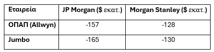 Οι «χαμένοι» φαίνεται να είναι η Allwyn (ΟΠΑΠ) και Jumbo. Σε αυτό το σημείο υπάρχει πλήρης σύγκλιση, με τις δύο μετοχές να εκτιμάται ότι θα δεχθούν εκροές.