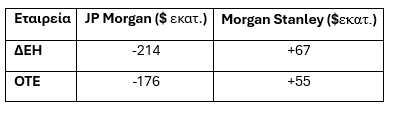 Η διαφοροποίηση αυτή οδηγεί και σε εντελώς διαφορετική συνολική εικόνα. Η JP Morgan βλέπει καθαρές εκροές περίπου 604 εκατ. δολαρίων. Η Morgan Stanley, αντίθετα, βλέπει καθαρές εισροές περίπου 300 εκατ. δολαρίων. Η διαφορά προκύπτει κυρίως από τις παραδοχές για τη σύνθεση του δείκτη και τη συμπεριφορά των επενδυτών.