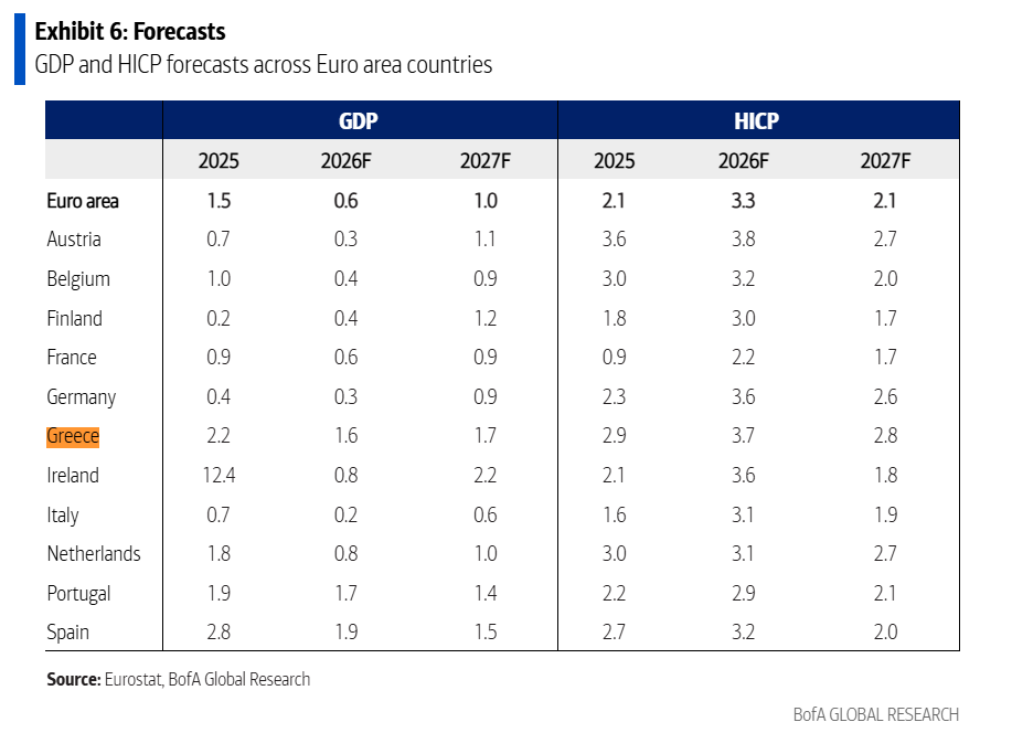 Η BofA βλέπει ρυθμό ανάπτυξης 1,6% το 2026 και 1,7% το 2027, σημαντικά υψηλότερα από το 0,6% και 1,0% της Ευρωζώνης, αλλά χαμηλότερα από την προηγούμενη πρόβλεψη για ανάπτυξη 1,8% φέτος.