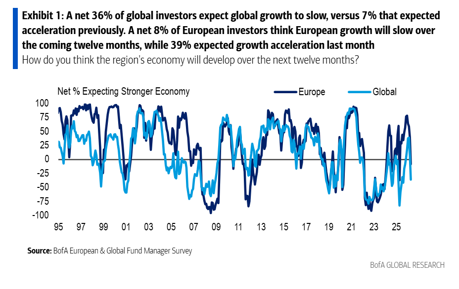 Η εικόνα είναι σαφώς πιο αρνητική σε σχέση με μόλις δύο μήνες πριν. Καθαρό ποσοστό 36% των επενδυτών εκτιμά πλέον ότι η παγκόσμια οικονομία θα επιβραδυνθεί μέσα στους επόμενους 12 μήνες, έναντι καθαρής πλειοψηφίας που «έβλεπε» επιτάχυνση τον Φεβρουάριο. Πρόκειται για τη μεγαλύτερη επιδείνωση των προσδοκιών από το 2022, στοιχείο που αποτυπώνει τη βίαιη αναπροσαρμογή των μακροοικονομικών σεναρίων.