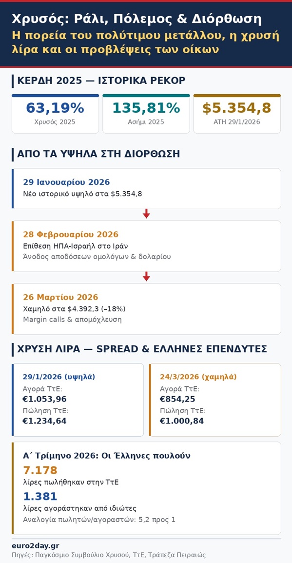 Όλα τα παραπάνω, ασφαλώς και είχαν απήχηση και στην τιμή της χρυσής λίρας, που κινήθηκε έντονα πτωτικά. Είναι ενδεικτικό ότι στις 29/1/2026, την ημέρας δηλαδή που ο χρυσός κατέγραφε νέα ιστορικά υψηλά, η ΤτΕ αγόραζε την χρυσή λίρα στα 1.053,96 ευρώ και την πουλούσε στα 1.234,64 ευρώ, ενώ στις 24/3 η τιμή αγοράς από την κεντρική τράπεζα κατρακύλησε στα 854,25 ευρώ και η τιμή πώλησης προς τους επενδυτές στα 1.000,84 ευρώ.