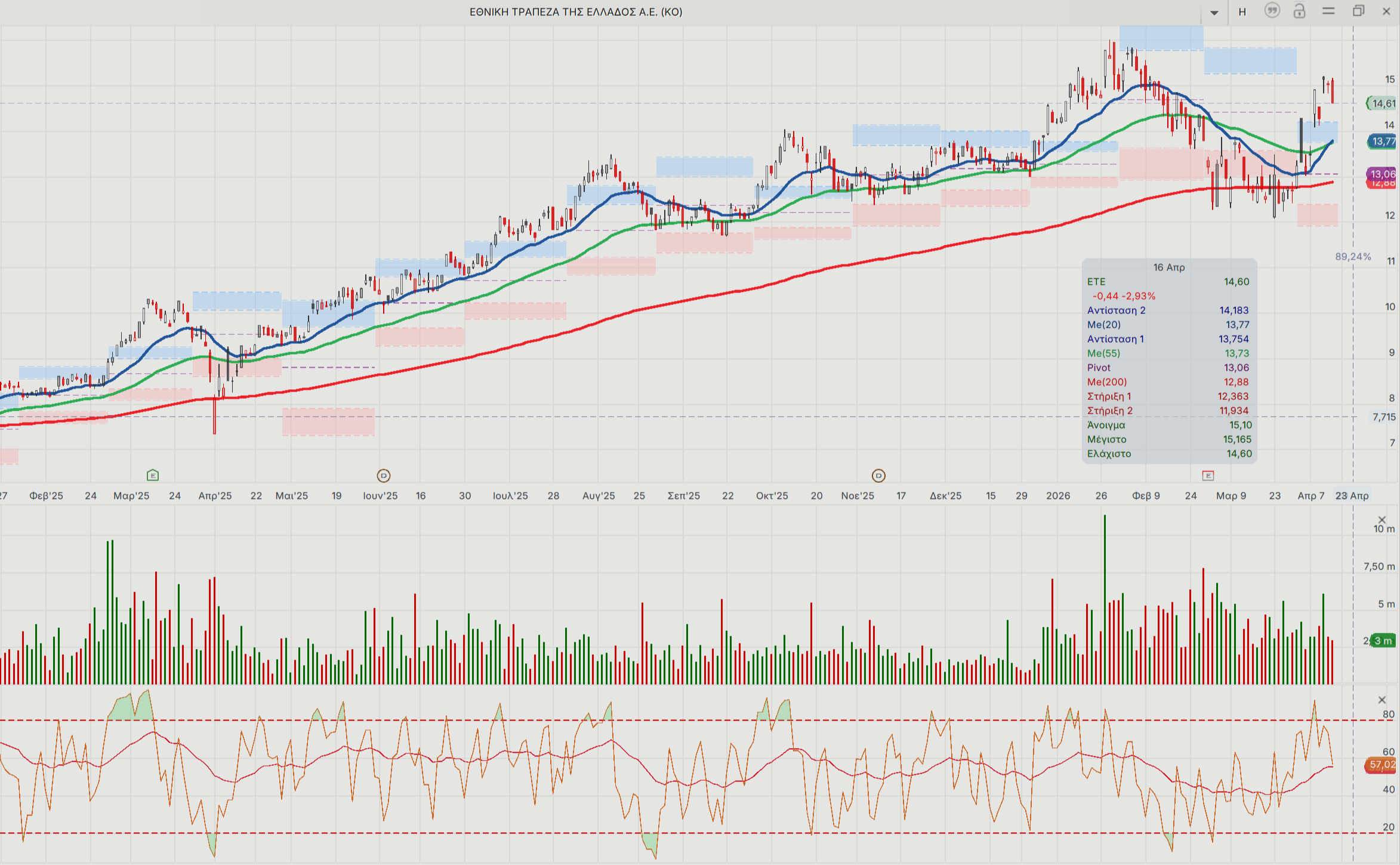 Ο RSI (14) στο 58,7 και ο MACD είναι σε θετικό επίπεδο και ενισχύουν το μομέντουμ. Σε εβδομαδιαίο επίπεδο η εικόνα παραμένει προσεκτικά θετική. Διάσπαση άνω των 15,04-15,20 ευρώ θα ενεργοποιήσει στόχους προς τα 16 ευρώ ή και υψηλότερα, ενώ καθοδική διάσπαση των 14,90 ευρώ θα επιφέρει πίεση βραχυπρόθεσμα.