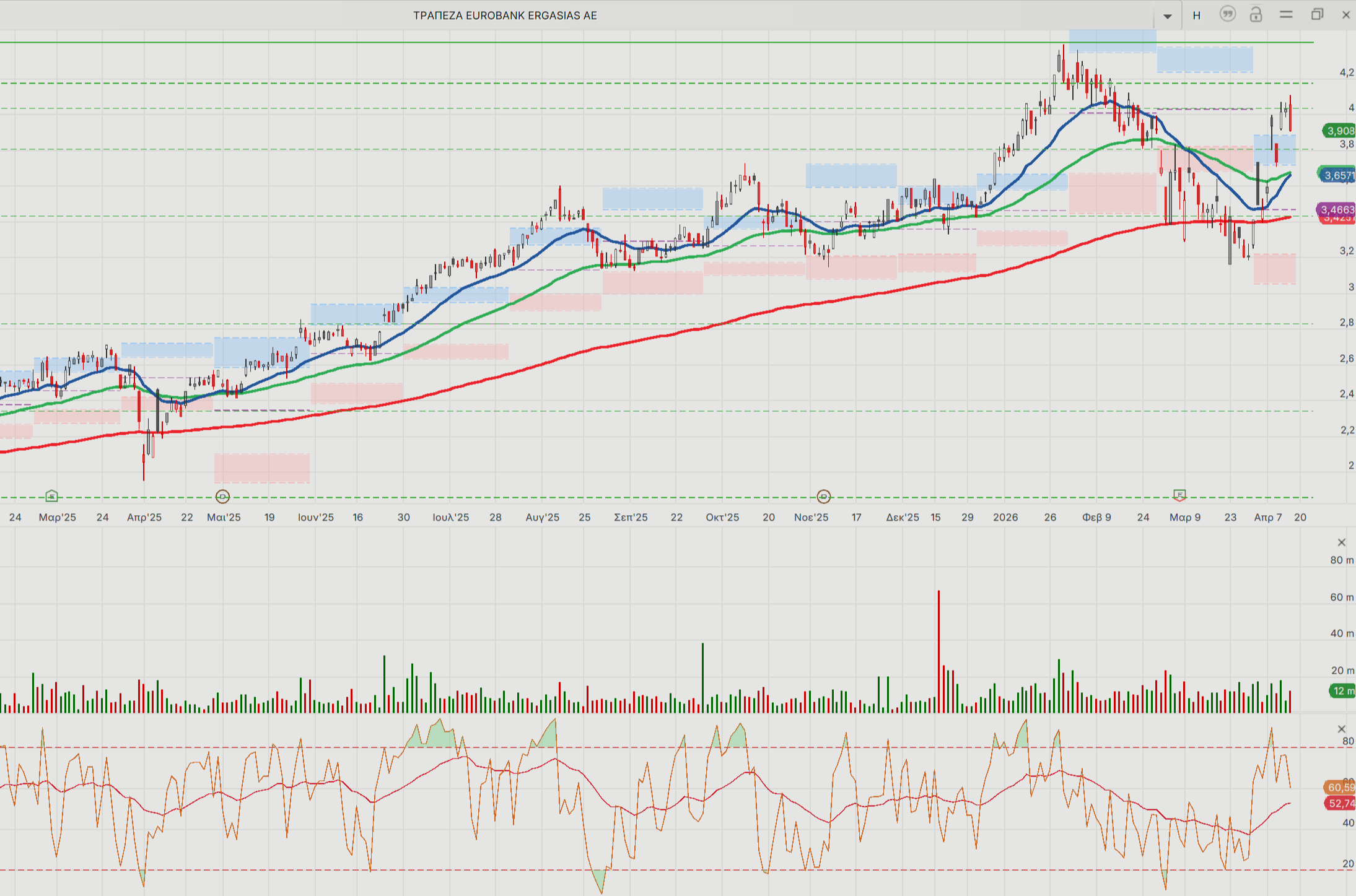 Η τιμή κινείται πάνω από το pivot point (4,025 ευρώ), με στήριξη στα 3,987-3,959 ευρώ (πρώτη στήριξη) και πρώτη αντίσταση στα 4,053-4,091 ευρώ. Ο ταλατωντής RSI (14) στο 65,9 (σήμα αγοράς) και MACD σε θετικό επίπεδο.