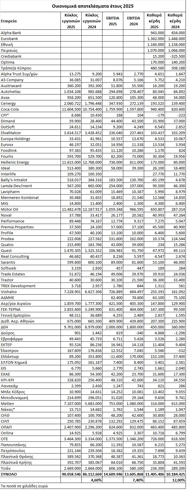 Συγκεκριμένα, τα καθαρά κέρδη 75 εισηγμένων εταιρειών (βλέπε στοιχεία παρατιθέμενου πίνακα) έχουν διαμορφωθεί στα 11,4 δισ. ευρώ (αυξημένα κατά 12% σε σύγκριση με πέρυσι) και βρίσκονται μια ανάσα πριν από τα 11,5 δισ. ευρώ, που ήταν η αθροιστική επίδοση του 2024 για το σύνολο των εισηγμένων.