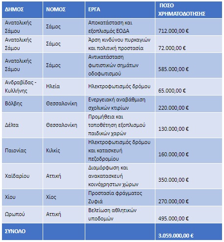 Στο δήμο Ανατολικής Σάμου εγκρίθηκε η χρηματοδότηση για αποκατάσταση και εξοπλισμό της Ολοκληρωμένης Εγκατάστασης Διάθεσης Απορριμμάτων (ΟΕΔΑ), άρση κινδύνου πυρκαγιών και πολιτική προστασία και αντικατάσταση φωτιστικών σωμάτων οδοφωτισμού Σάμου, Βαθέως, Παλαιοκάστρου και Μυτιληνιών, στο δήμο Ανδραβίδας - Κυλλήνης χρηματοδοτείται ο ηλεκτροφωτισμός της οδού Καλφιώτη της Κοινότητας Ανδραβίδας, στο δήμο Βόλβης η ενεργειακή αναβάθμιση των σχολικών κτιρίων των οικισμών Νέας Απολλωνίας, Προφήτη, Νυμφόπετρας και Νέας Μαδύτου, στο δήμο Δέλτα η προμήθεια και τοποθέτηση εξοπλισμού παιδικών χαρών, στο δήμο Παιονίας ο ηλεκτροφωτισμός του δρόμου Πολύκαστρου - Γέφυρας Αξιού και η κατασκευή πεζοδρομίου Πολυκάστρου - Νέας Καβάλας, στο δήμο Χαϊδαρίου η διαμόρφωση και ανακατασκευή κοινόχρηστών χώρων, στο δήμο Χίου η προστασία του φράγματος Ζυφιά και στο δήμο Ωρωπού η βελτίωση αθλητικών υποδομών της Δημοτικής Ενότητας Μαλακάσας.