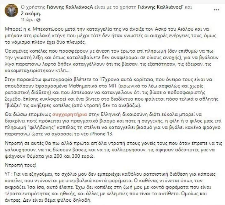 Σημειώνεται ότι η (παρακάτω) ανάρτηση κατέβηκε από τον Γ. Καλλιάννο ο οποίος έγραψε σε νέα ανάρτηση (παραπάνω): "Η ανάρτηση μου για την καταγγελία του βιασμού, ενώ αυτή εκκρεμεί στη δικαιοσύνη, ήταν λάθος γι΄αυτό και την κατέβασα".