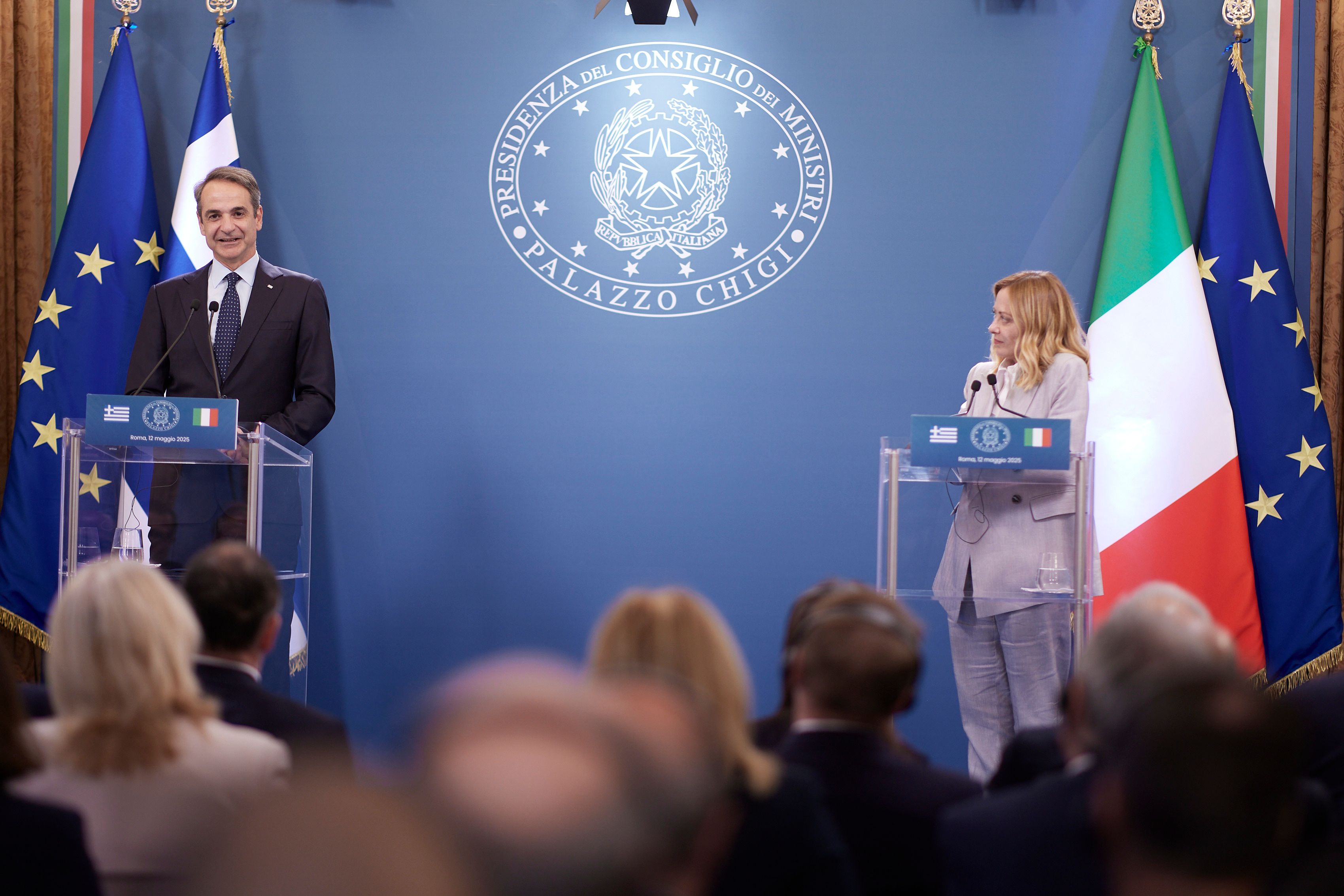 Μετά τη συνεδρίαση του Ανώτατου Συμβουλίου Συνεργασίας Ελλάδας – Ιταλίας στη Ρώμη, ο πρωθυπουργός Κυριάκος Μητσοτάκης προχώρησε σε κοινές δηλώσεις με την Ιταλίδα ομόλογό του, Τζόρτζια Μελόνι.