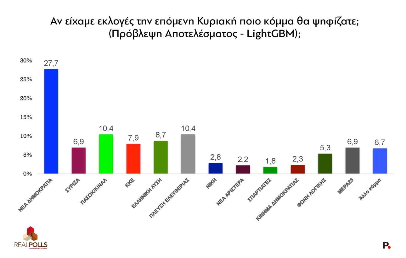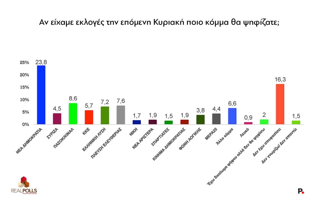 Σταθερή εικόνα για τη Νέα Δημοκρατία αλλά και πτώση για το ΠΑΣΟΚ με άνοδο της Πλεύσης Ελευθερίας καταγράφει δημοσκόπηση της RealPolls για το protagon.