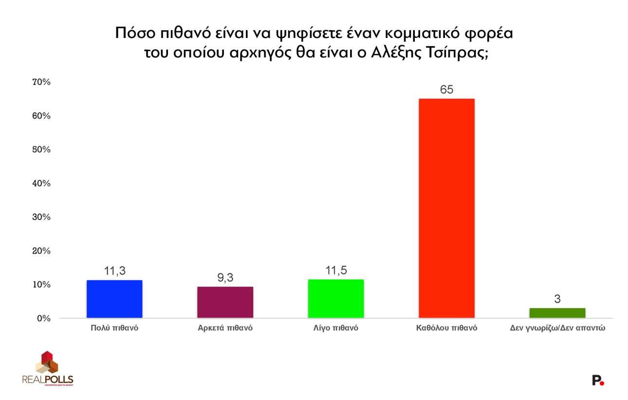 Για το φημολογούμενο κόμμα Τσίπρα, στην έρευνα του Οκτωβρίου, και παρά την αυξημένη δημοσιότητα λόγω παραίτησης και διαφήμισης του βιβλίου, καταγράφηκε κάμψη της δυνητικής ψήφου (δηλαδή των απαντήσεων στο ερώτημα «πόσο πιθανό είναι να ψηφίσετε το κόμμα αυτό»)