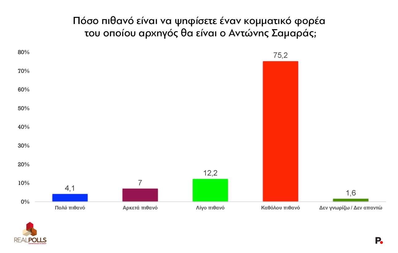 Από την άλλη, για το πιθανολογούμενο κόμμα του Αντώνη Σαμαρά, στην ίδια ερώτηση το πολύ πιθανό / αρκετά πιθανό αθροίζει 11,1% (από 10,2% τον Σεπτέμβριο). Ο πρώην πρωθυπουργός και πρώην πρόεδρος της ΝΔ έχει «εξασφαλισμένο» μόνο ένα 4,1%.