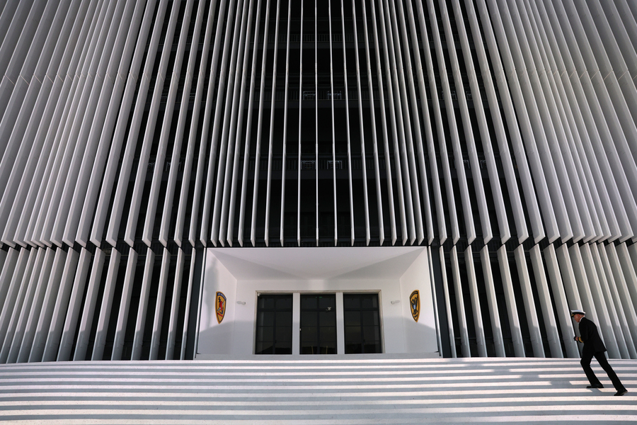 Η νότια όψη του κτιρίου, σημειώνουν οι ίδιες πηγές, έχει συνολικό μήκος μεγαλύτερο από 340 μέτρα και καλύφθηκε εξωτερικά στο σύνολό της με λευκές περσίδες αλουμινίου.