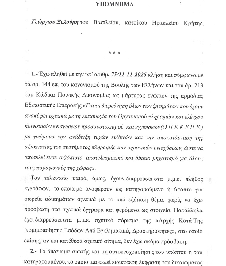 «Τον τελευταίο καιρό έχουν διαρρεύσει στα ΜΜΕ πλήθος εγγράφων, τα οποία με αναφέρουν ως κατηγορούμενο ή ύποπτο για σωρεία αδικημάτων σχετικά με το υπό εξέταση θέμα, χωρίς να έχω πρόσβαση στα σχετικά έγγραφα και φερόμενα ως στοιχεία. Παράλληλα έχουν διαρρεύσει στα ΜΜΕ σχετικό πόρισμα της Αρχής Κατά της Νομιμοποίησης Εσόδων από Εγκληματικές δραστηριότητες, το οποίο επίσης αν και κατέθεσα σχετικό αίτημα δεν έχω ακόμη πρόσβαση», σημειώνει στο υπόμνημά του ο Γ. Ξυλούρης και προσθέτει: