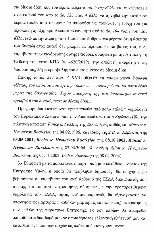 «Σύμφωνα με τα παραπάνω, η μαρτυρική μου κατάθεση ενώπιον της επιτροπής υμών, η οποία θα προβληθεί δημοσίως, θα οδηγήσει με βεβαιότητα σε παραβίαση του κατ' άρθρο 6 της ΕΣΔΑ δικαιώματός μου σιωπής και μη αυτοενοχοποίησης σύμφωνα με την προπαρατιθέμενη νομολογία του ΕΣΔΑ, αφού, εφόσον παραστώ, θα εξαναγκαστώ να απαντήσω ως μάρτυρας (καθήκον μαρτυρίας και αληθείας) σε ερωτήσεις των μελών της παραπάνω Επιτροπής, εκ των οποίων θα αναιρεθεί οποιοδήποτε δικαίωμά μου σε οποιαδήποτε μελλοντική κλήτευσή μου και κατάθεση ενώπιον των αρχών ως υπόπτου ή κατηγορουμένου».