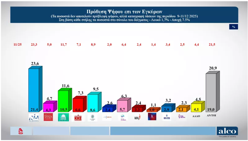 Ανεβασμένα σε σχέση εμφανίζονται τα ποσοστά των κομμάτων στην τελευταία δημοσκόπηση της Alco για λογαριασμό του Alpha σε σχέση με την προηγούμενη.