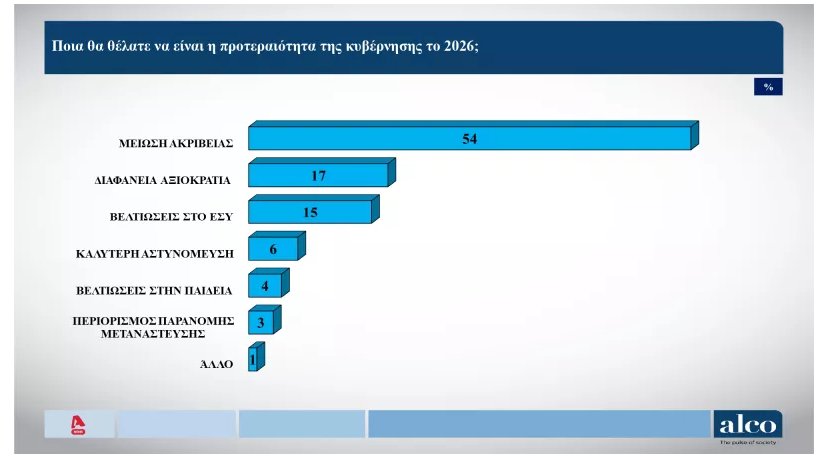 Ειδικότερα, το 54% θα ήθελε η κύρια προτεραιότητα για την κυβέρνηση το 2026 να είναι η μείωση της ακρίβειας ενώ το 17% θέλει η κυβέρνηση να εστιάσει στη διαφάνεια και την αξιοκρατία. Το 15% θέλει η κυβέρνηση να επικεντρωθεί στις βελτιώσεις στο ΕΣΥ, το 6% στην καλύτερη αστυνόμευση, το 4% στις βελτιώσεις στην παιδεία και το 3% στον περιορισμό της παράνομης μετανάστευσης.