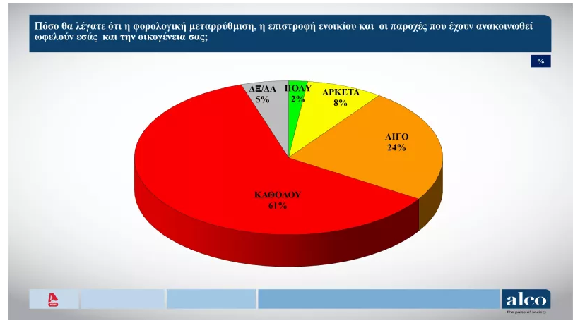 Στο ερώτημα για το πόσο θα έλεγαν οι πολίτες ότι η φορολογική μεταρρύθμιση, η επιστροφή ενοικίου και οι παροχές που έχουν ανακοινωθεί τους ωφελούν τους ίδιους και την οικογένειά τους, το 61% απάντησε καθόλου, το 24% λίγο, το 8% αρκετά και πολύ απάντησε το 2%.