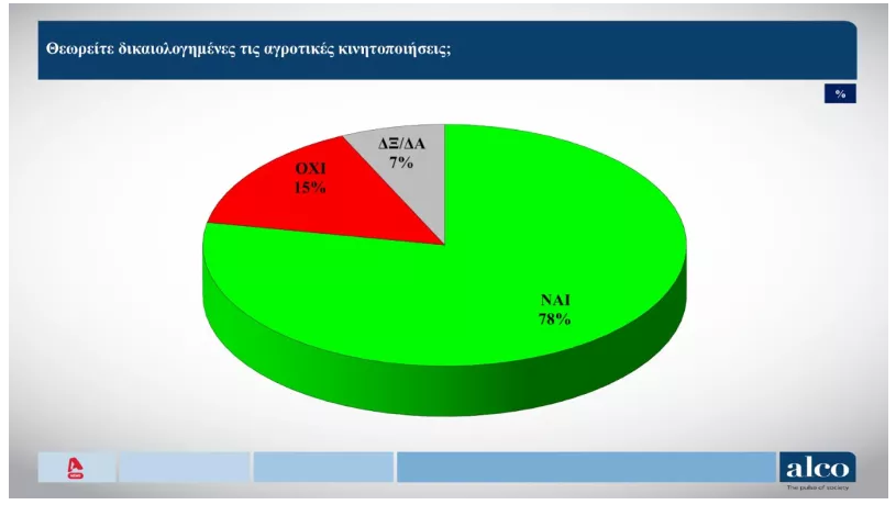 Όσον αφορά τις αγροτικές κινητοποιήσεις, το 78% απάντησε ότι τις θεωρεί δικαιολογημένες, έναντι του 15% που πιστεύει το αντίθετο.