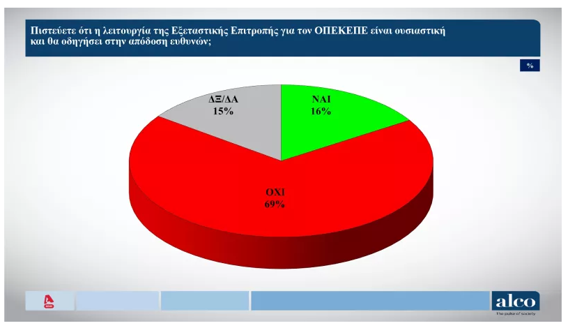 Παράλληλα, για τη λειτουργία της Εξεταστικής Επιτροπής για τον ΟΠΕΚΕΠΕ, το 69% θεωρεί δεν είναι ουσιαστική και δεν πιστεύει ότι θα οδηγήσει σε απόδοση ευθυνών, αντίθετα με το 16% που είναι πιο αισιόδοξο.