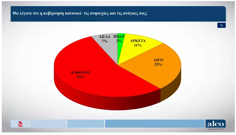 Στο ερώτημα του αν θα έλεγαν ότι η κυβέρνηση κατανοεί τις ανησυχίες και τις ανάγκες τους, το 55% απάντησε καθόλου, το 25% λίγο, το 11% αρκετά και μόλις το 2% πολύ.