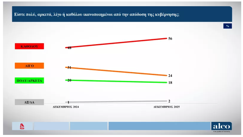 Στο μεταξύ, όσον αφορά την απόδοση της κυβέρνησης, το 56% δεν είναι καθόλου ικανοποιημένο, σε σχέση με το 48% τον Δεκέμβριο του 2024, ενώ λίγο ικανοποιημένο δήλωσε το 24%, από 31%. Πολύ / Αρκετά ικανοποιημένο δήλωσε το 18%, από 20% τον Δεκέμβριο του 2024.