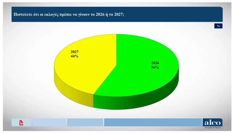 Ακόμη, σε ερώτηση για το αν εκλογές πρέπει να γίνουν το 2026 ή το 2027, το 56% εξέφρασε την άποψη ότι εκλογές πρέπει να γίνουν το 2026 ενώ το 44% δήλωσε πως πρέπει να γίνουν το 2027.