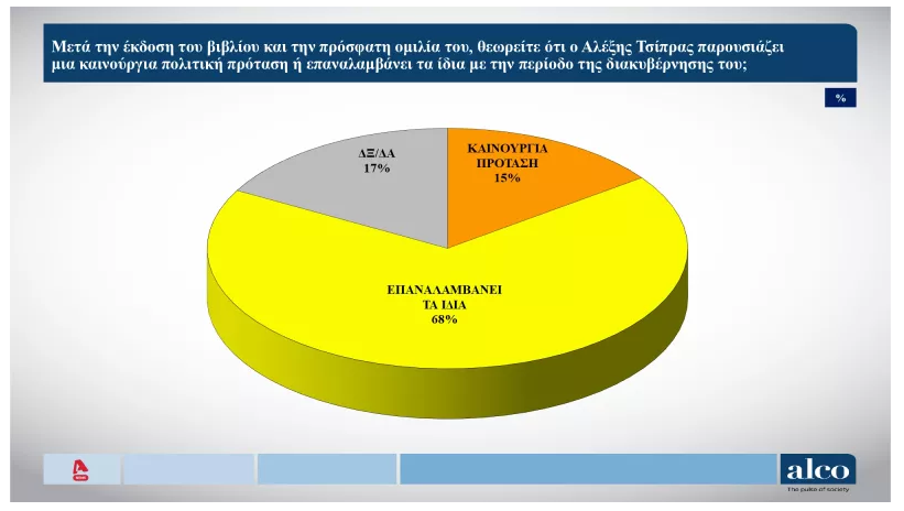 Στο μέτωπο του Αλέξη Τσίπρα, στο ερώτημα για το αν μετά την έκδοση του βιβλίου του «Ιθάκη» και την πρόσφατη ομιλία του, θεωρούν ότι ο πρώην πρωθυπουργός παρουσιάζει μια καινούργια πολιτική πρόταση ή επαναλαμβάνει τα ίδια με την περίοδο της διακυβέρνησής του, το 68% απάντησε ότι επαναλαμβάνει τα ίδια ενώ το 15% πιστεύει ότι παρουσιάζει μια νέα πρόταση.