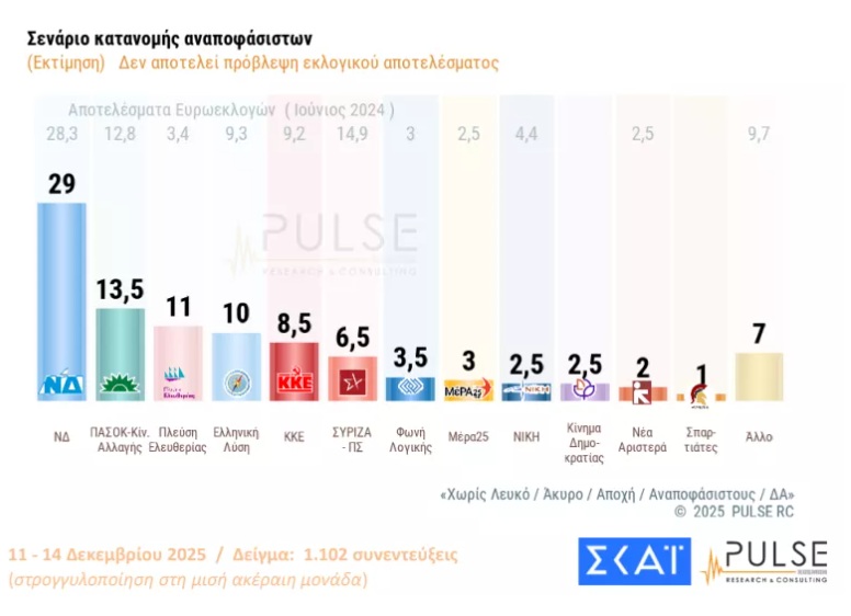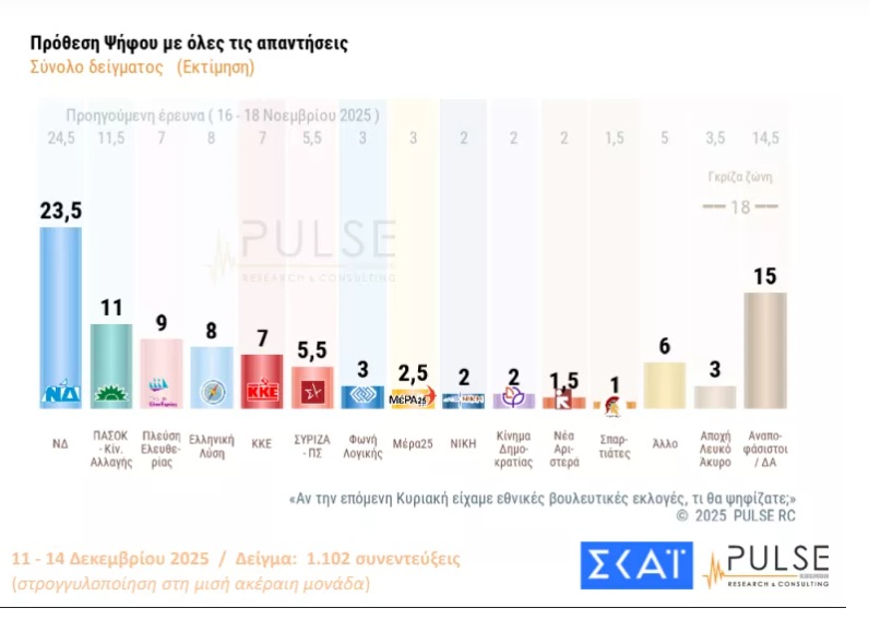 Στην πρόθεση ψήφου, η Νέα Δημοκρατία χάνει μία ποσοστιαία μονάδα, σε σύγκριση με τη δημοσκόπηση της Pulse τον Νοέμβριο, ωστόσο θεωρείται ότι κρατάει τις σταθερές της, παρ' ότι οι αγρότες είναι τρεις εβδομάδες στους δρόμους και το σκάνδαλο του ΟΠΕΚΕΠΕ συνεχίζει να εξελίσσεται.