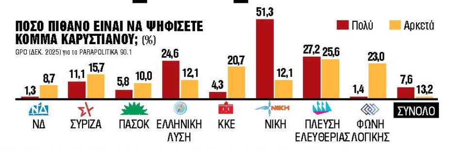 Από τη Νέα Δημοκρατία, μόλις το 10% δηλώνει «πολύ» ή «αρκετά» πιθανό να στηρίξει ένα κόμμα Καρυστιανού, ενώ στο ΠΑΣΟΚ το αντίστοιχο ποσοστό ανέρχεται στο 15,8%.