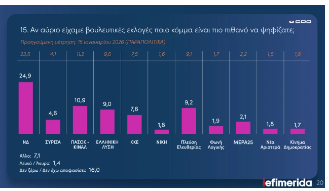 Στο 30,1% διαμορφώνεται το ποσοστό της ΝΔ στην εκτίμηση ψήφου, σε δημοσκόπηση της GPO για λογαριασμό της iefimerida.gr.