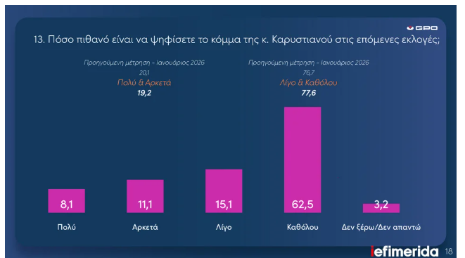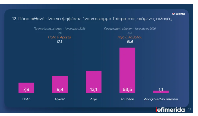 Στο μέτωπο των υπό ίδρυση κομμάτων, παρατηρείται μάλλον μια κόπωση στο εκλογικό σώμα από την πολύμηνη συζήτηση και αναμονή, που περισσότερο περιορίζει τη δυναμική των νέων σχηματισμών παρά την τροφοδοτεί. Συγκεκριμένα, η πιθανότητα ψήφου σ’ ένα νέο κόμμα του κ. Τσίπρα καταγράφεται ως πολύ και αρκετά ισχυρή με 17,3%, ενώ το αντίστοιχο ποσοστό για την κ. Καρυστιανού ανιχνεύεται στο 19,2%, ελαφρώς μειωμένο σε σχέση με τον προηγούμενο μήνα.