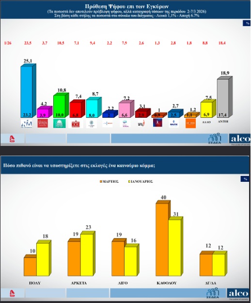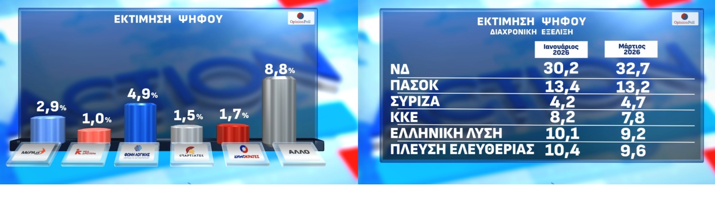 Σύμφωνα με την έρευνα, η Νέα Δημοκρατία ενισχύει τη θέση της, εμφανίζοντας άνοδο 2,5 ποσοστιαίων μονάδων, καθώς η εκτίμηση ψήφου αυξάνεται από 30,2% τον Ιανουάριο σε 32,7% τον Μάρτιο. Το εύρημα συνδέεται με το κλίμα ανησυχίας για τις διεθνείς εξελίξεις και το ισχυρό αίτημα πολιτικής σταθερότητας που καταγράφεται στην κοινή γνώμη.