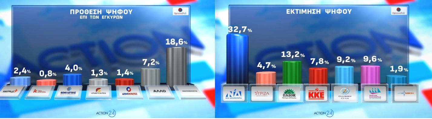 Αντίθετα, το ΠΑΣΟΚ εμφανίζει μικρή υποχώρηση, από 13,4% σε 13,2%, ενώ ο ΣΥΡΙΖΑ σημειώνει άνοδο, από 4,2% σε 4,7%, παραμένοντας ωστόσο σε χαμηλά επίπεδα.
