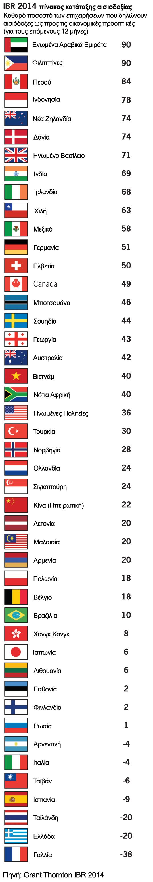 Αντίθετα, καμία χώρα δεν είναι τόσο απαισιόδοξη για το 2014, όσο η Γαλλία, με το ποσοστό να αγγίζει το -38%. Οι επιχειρήσεις στη Γαλλία είναι πιο απαισιόδοξες από τις επιχειρήσεις στην Ελλάδα (-20%), στην Ισπανία (-9%) και στην Ιταλία (-4%). Οι γαλλικές επιχειρήσεις είναι, επίσης, και οι πιο απαισιόδοξες σε παγκόσμιο επίπεδο σε ό,τι αφορά τις προσδοκίες τους για έσοδα (8%) και κέρδη (-4%) για το 2014.