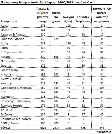 Τα μέγιστα χρεωστικά υπόλοιπα των 24 χρεωστών που περιλαμβάνονται στο έγγραφο της Τρ. Κύπρου πλησιάζουν τα €5 δισ. και μόνο τα €645 εκ. ήταν τον Ιούνιο του 2013 μη εξυπηρετούμενα – δηλαδή το 14%.