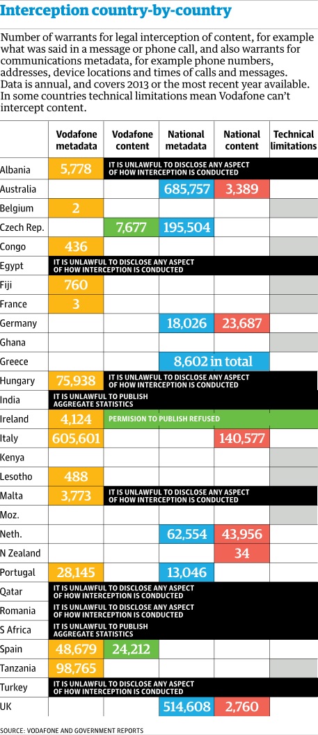 Η Vodafone δεν διευκρίνισε ποιες είναι οι έξι χώρες, αναφέροντας ότι υπάρχουν νομικά εμπόδια για αυτό.