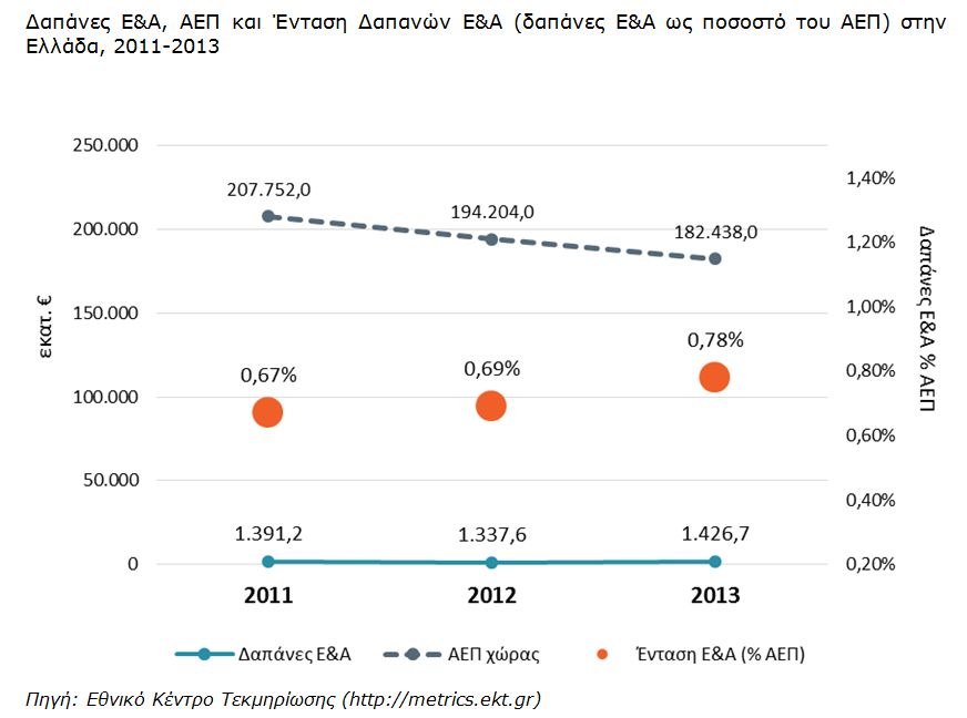 Συνολικά το 2013, οι δαπάνες για Ε&Α στην Ελλάδα ήταν 1.426,7 εκατ. ευρώ, αυξημένες κατά 89,1 εκατ. ευρώ σε σχέση με το 2012, και κατά 35,5 εκατ. ευρώ σε σχέση με το 2011, σύμφωνα με στοιχεία τού Εθνικού Κέντρου Τεκμηρίωσης.