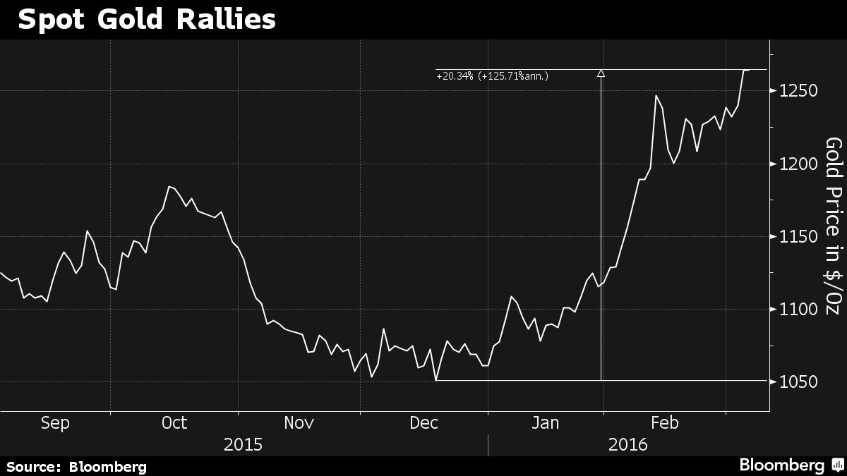 Οι ράβδοι ήταν στα 1.264,25 δολάρια η ουγγιά την Πέμπτη, το οποίο σηματοδοτεί μια άνοδο 20% από τα πρόσφατα χαμηλά του Δεκεμβρίου. Σήμερα οι τιμές έπεσαν σε 1.261,30 δολάρια στη Σιγκαπούρη, περιορίζοντας την εβδομαδιαία άνοδο σε 3,1%.