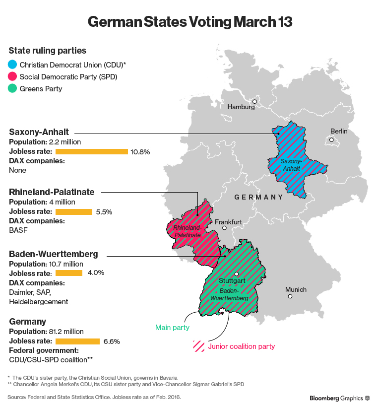Πιο σημαντικό είναι το Baden-Wuerttemberg, ένα κράτος με πληθυσμό 10,7 εκατ. ανθρώπων στα σουηδικά σύνορα, με οικονομία μεγαλύτερη από της Πολωνίας. «Πατρίδα» εταιριών όπως οι Porsche, Daimler και HeidelbergCement, κυβερνάται από τους Πρασίνους από το 2011. Τώρα οι δημοσκοπήσεις καταδεικνύουν πως το κόμμα της Άνγκελα Μέρκελ θα δυσκολευτεί να ξανακερδίσει την ηγεσία του κρατιδίου. Εκλογές έχουν και στο Rhineland-Palatinate, πατρίδα του πρώην καγκελάριου Χέλμουτ Κολ, και το Saxony-Anhalt. Το τελευταίο εμφανίζει ποσοστό ανεργίας περίπου 11%.