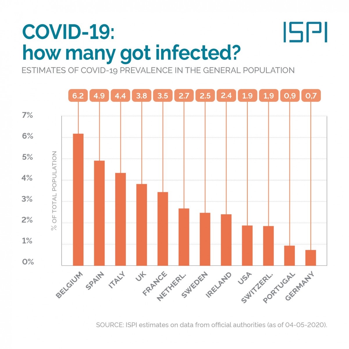 To ISPI υπολογίζει ότι η πιθανή διάδοση του ιού στις 12 αυτές χώρες δεν ξεπερνά το 7%, και σχεδόν σε όλες βρίσκεται κάτω του 5%. Στις τρεις μεγαλύτερες της Ευρώπης (Ιταλία, Βρετανία, Ισπανία και Γαλλία) τα πιθανά ποσοστά διάδοσης του ιού υπολογίζονται σε 3-4%, ενώ στη Γερμανία είναι κάτω του 1%.