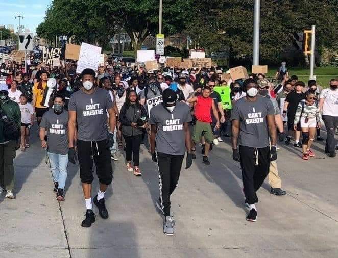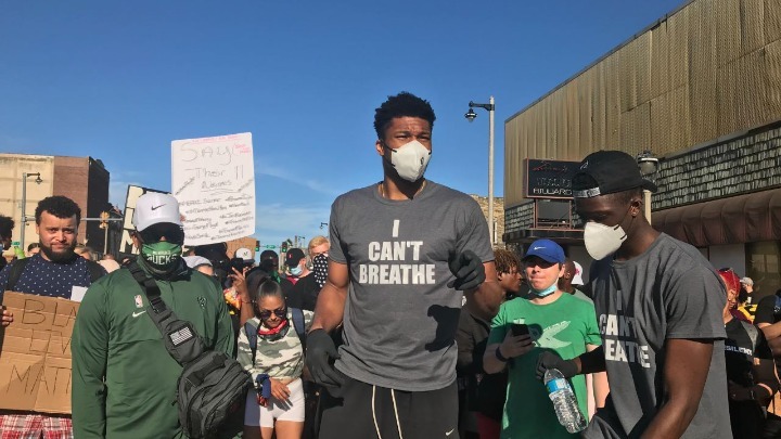 Συνοδευόμενος από αρκετούς συμπαίκτες του στους Μπακς, ο Αντετοκούνμπο φορώντας προστατευτική μάσκα, γάντια και μία μπλούζα με το μήνυμα «δεν μπορώ να αναπνεύσω», τίμησε τον Τζορτζ Φλόϊντ, ο οποίος δολοφονήθηκε προ ημερών στην Μινεάπολη από αστυνομικό, κατά την διάρκεια της σύλληψης του. Αυτή η φράση, ήταν τα τελευταία λόγια του νεκρού Αφροαμερικανού και πλέον έχει γίνει παγκόσμιο σύνθημα κατά των διακρίσεων και της αστυνομικής βίας.