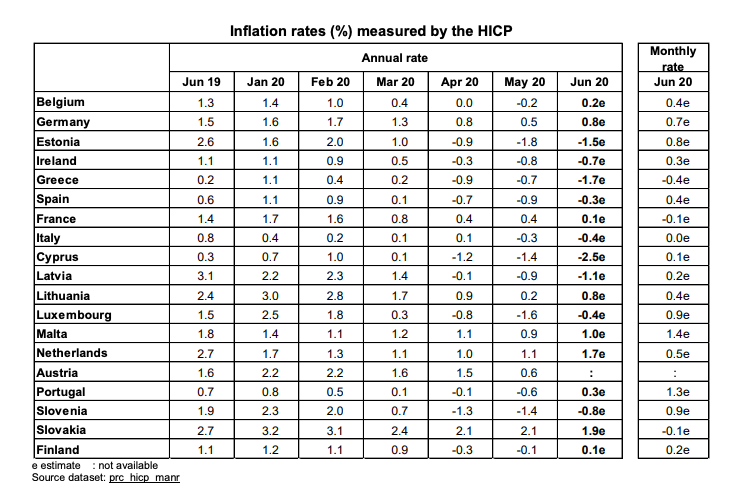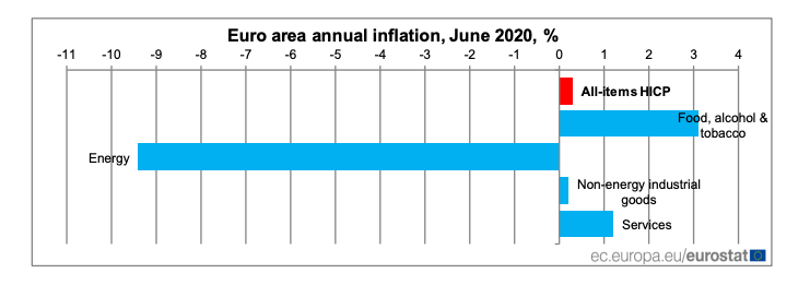 Tον Ιούνιο του 2020, μήνα που πολλά περιοριστικά μέτρα για την καταπολέμηση της Covid-19 αποσύρθηκαν σταδιακά, ο ετήσιος πληθωρισμός για την ευρωζώνη αναμένεται να διαμορφωθεί στο 0,3%, καταγράφοντας άνοδο από το ετήσιο 0,1% του Μαΐου, σύμφωνα με την προκαταρκτική εκτίμηση της Εurostat.