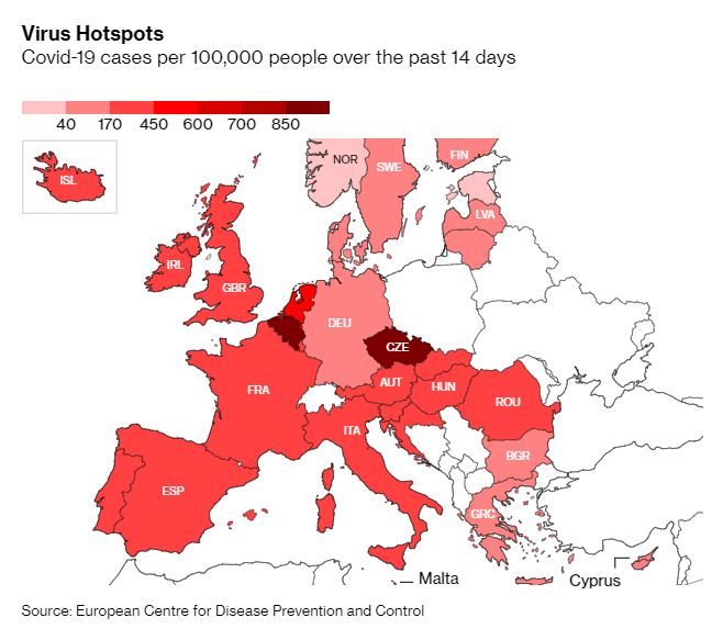Στην Ισπανία, οι κυβερνήσεις των περιφερειών της Αραγονίας και της Λα Ριόχα, στη βόρεια Ισπανία, ανακοίνωσαν την Τετάρτη ότι θα περιορίσουν την κινητικότητα του ενός και πλέον εκατομμυρίου κατοίκων συνολικά σε αυτές τις περιοχές, οι οποίες καταγράφουν περισσότερα από 500 κρούσματα της Covid-19 ανά 100.000 κατοίκους σε διάστημα 14 ημερών, ένα από τα κριτήρια για την εφαρμογή αυτού του είδους των μέτρων.